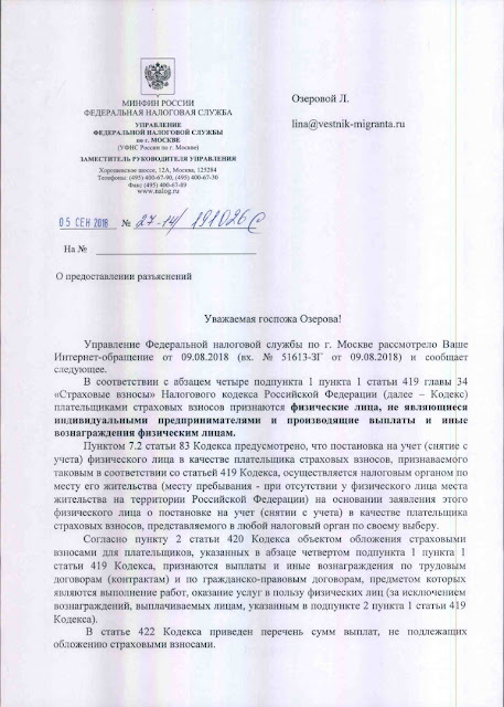 Как вам такой ответ от ФНС? (Вопрос был привязан к ситуации «гражданка Украины с патентом присматривает за ребенком физлица»)